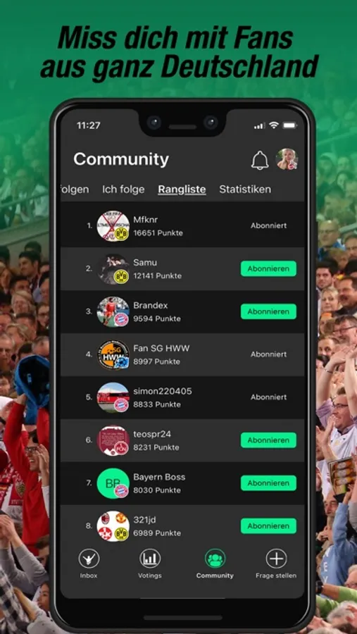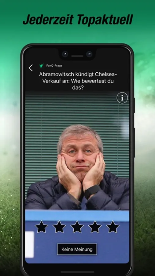 Abstimmen, Meinungen vergleichen und diskutieren: Vom passiven Zuschauer zum aktiven Mitspieler bei der schönsten Nebensache der Welt! Kostenlos und ohne Registrierung. Nicht nur Umfragen, sondern Unterhaltung, News, Spannung, Überraschung und vor allem Diskussionsstoff. Also, sei dabei, lade dir jetzt die App herunter und vote mit.