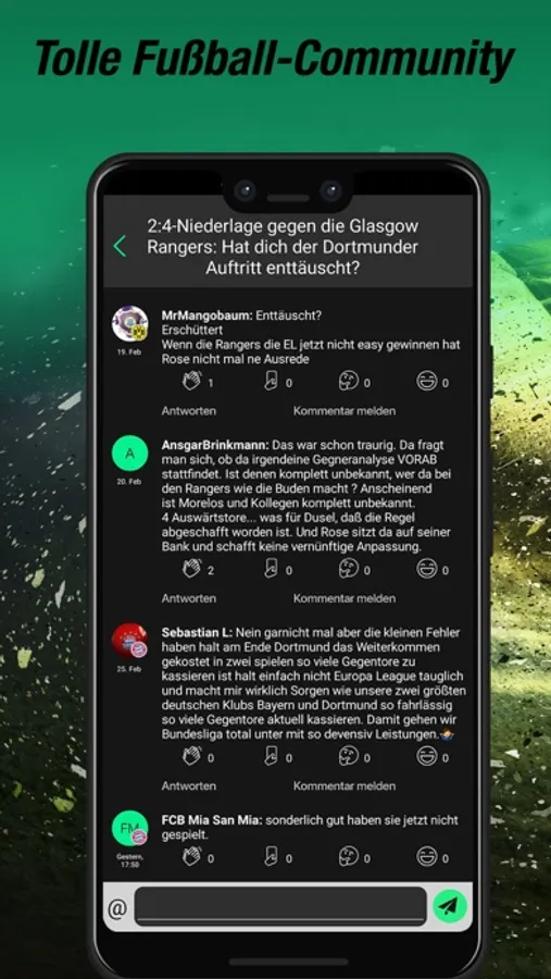 Die transparenten Abstimmungs-Ergebnisse stehen anschließend zur Diskussion. Jeder kann seine Meinung sagen. Denn was macht mehr Spaß, als mit den Freunden über Schiedrichter-Entscheidungen, Ergebnisse, Traumtore, neue DFB- oder Fifa-Regeln oder Auf- und Abstiegskandidaten zu diskutieren? Sei dabei!