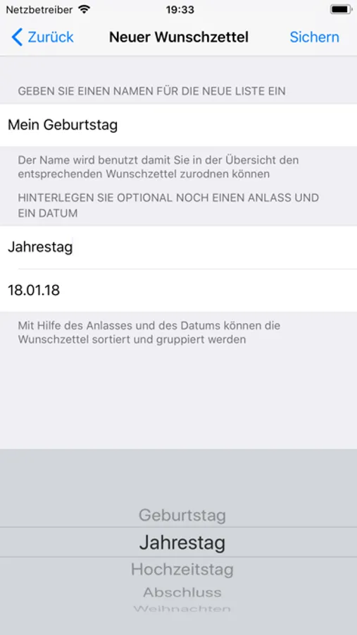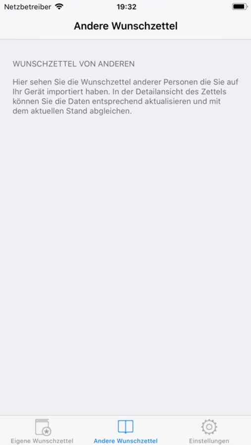 While sharing the current information from your wish list will be saved onto another device. Therefore you only have to click the link out of the share message to import it to the new device. If the receiver does not have the app installed, he will aslo get an overview from your ideas as simple text message. Additionally you can get push informations for changes made to the other wish lists.