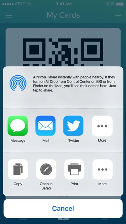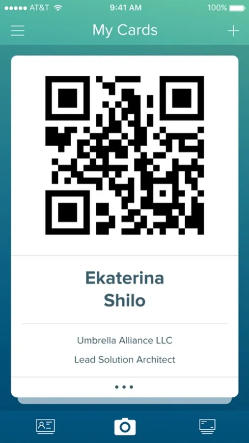 - Share your card with a QR code or via any email / texting app (whatsapp, viber, etc) as a generic contact file (.vcf)