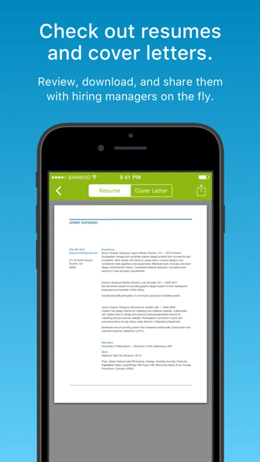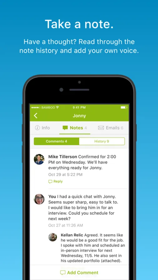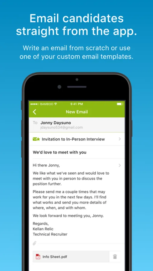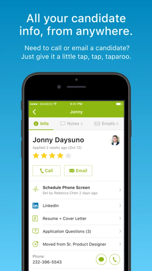 With the BambooHR Hiring app, you and your hiring team can review a candidate the instant they apply. Evaluate resumes, review answers to application questions, communicate with applicants via email, phone & text, and collaborate with hiring managers and recruiters—all from one talent acquisition app that moves at the speed of your candidates.