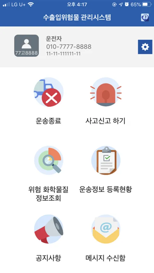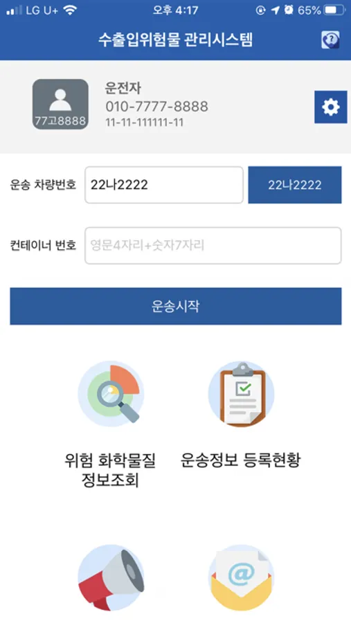 모바일 어플리케이션은 운송과정을 모니터링 하여, 위험물의 고유식별번호, 위험물 차량번호, 위험물 컨테이너번호, 핸드폰 위치정보, 사용자 아이디 등을 전송하게 됩니다.