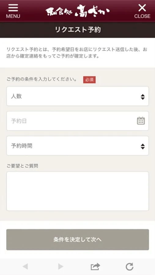希望の人数・日時を指定して送信するだけで予約を依頼できます。