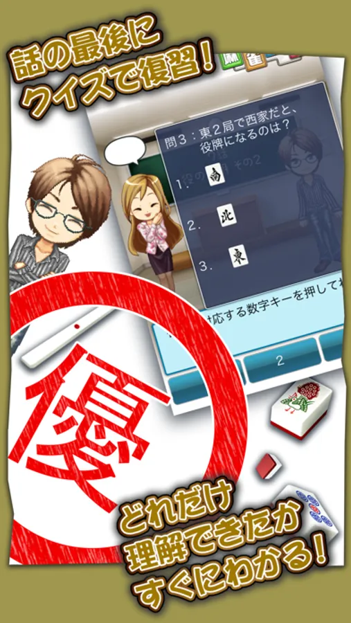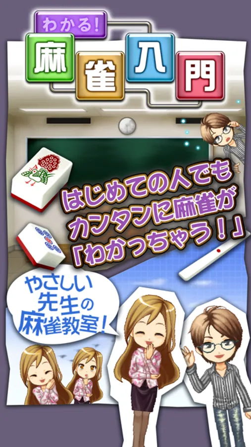 「わかる!麻雀入門」アプリでは、はじめての方なら誰でも「?」と感じる麻雀の部分を初心者の生徒が代わりに質問してくれるので、それに答える先生の言葉が自然と頭に入ります!