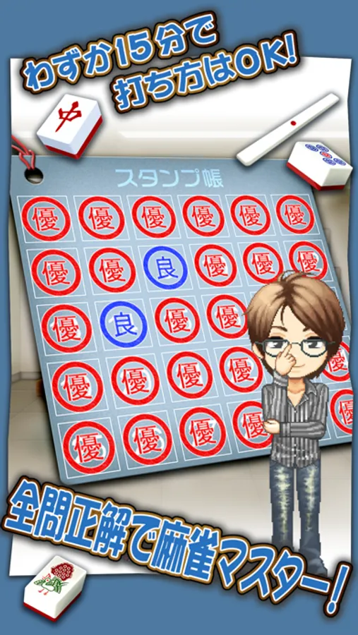 全30話で「優」のスタンプを集めることが出来れば、すぐにでも麻雀が始められるだけの知識が身についています。