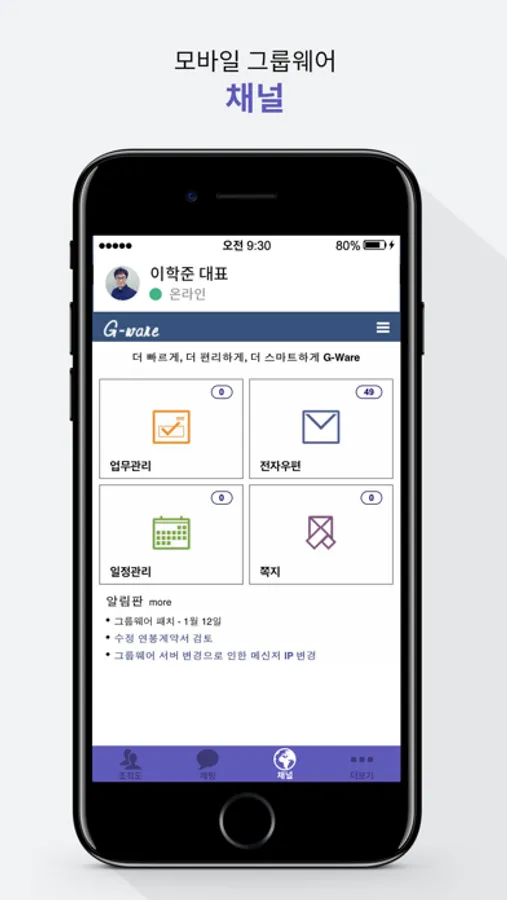 지톡(G-Talk)은 G-Ware의 이메일, 전자결재, 게시판, 일정에서 새로운 내용이 등록될 때 채팅 메시지로 알려주고 모바일에서 쉽게 확인할 수 있게 해줍니다. 또한 회사 구성원들과 채팅을 통해서 업무를 진행할 수 있어서 유기적인 협력이 가능하게 해줍니다.