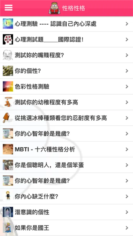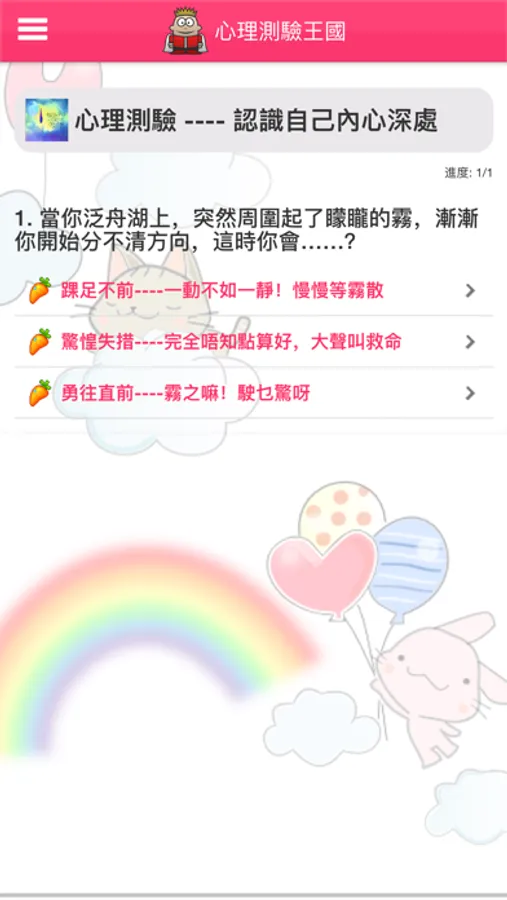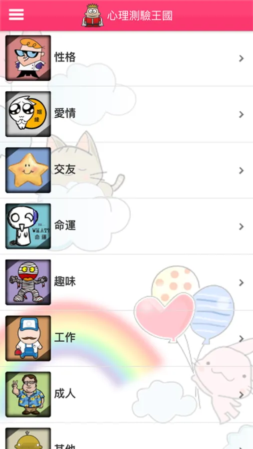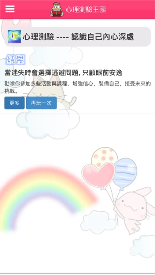 心理測驗王國是一個充滿歡樂及幸福的花圃,圜丁們每天都為你們種植各式各樣的遊戲和驚喜。