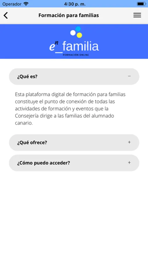 - Formación para Familias. A través de la aplicación se podrá acceder a los cursos online gratuitos que ofrece la Consejería de Educación, Universidades, Cultura y Deportes para padres y madres.