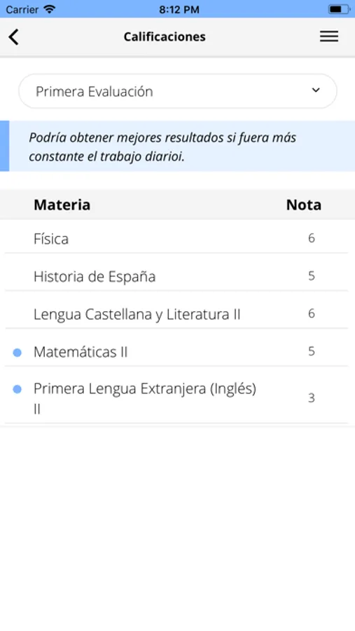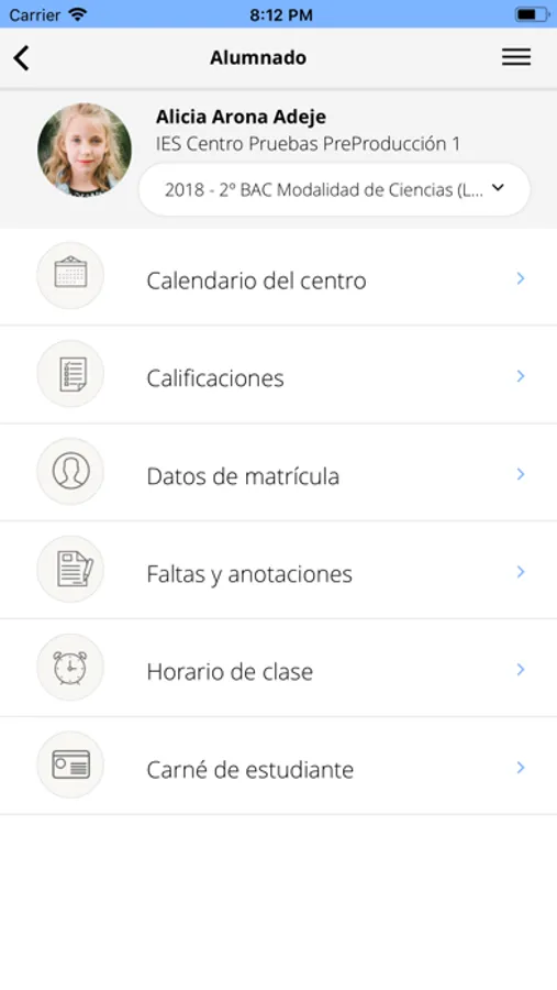 - Alumnado. El alumnado podrá consultar los datos de su matrícula y acceder a toda la información relacionada (calificaciones, faltas y anotaciones, horario de clase, calendario de centro, carné del estudiante).