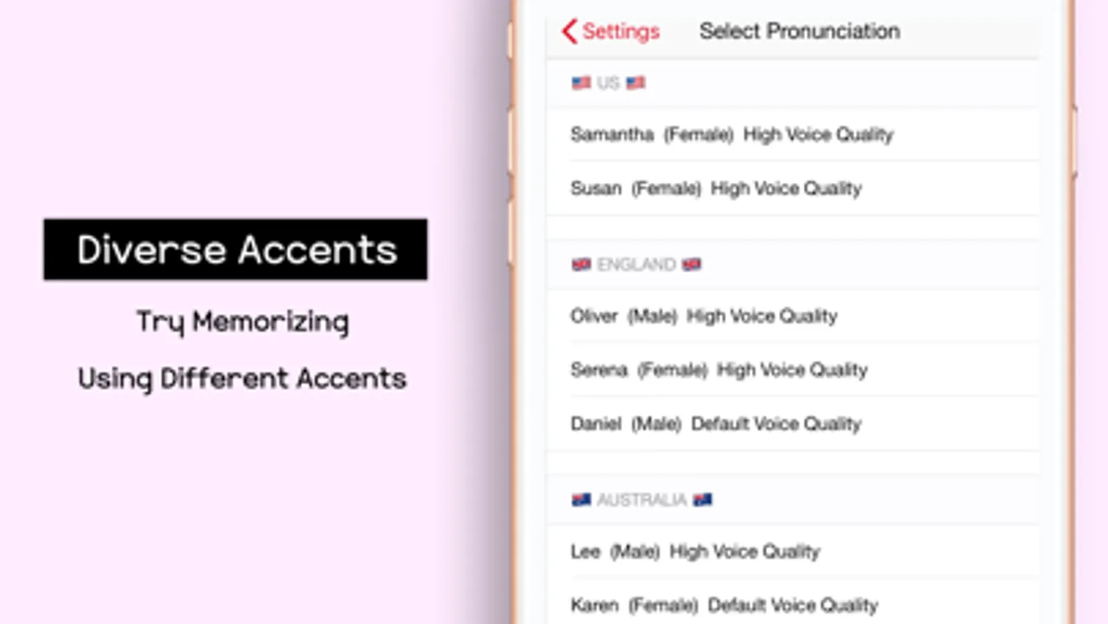 5. DIFFERENT ACCENTS. Since there are many audio related features, and not everyone is located in US, this app makes sure to include other accents like British, Australian, Ireland, and South Africa.