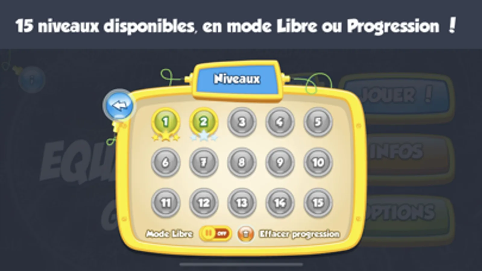 15 niveaux, correspondant à des degrés de difficulté croissants, sont disponibles. Il n’est possible de passer au niveau suivant que si le niveau en cours est validé (obtention d’au moins une étoile)