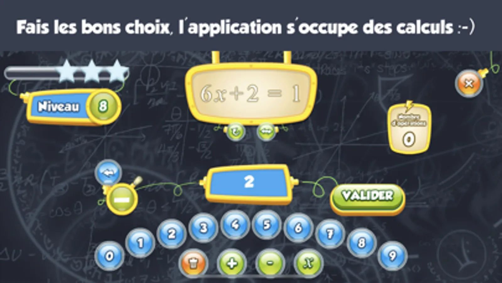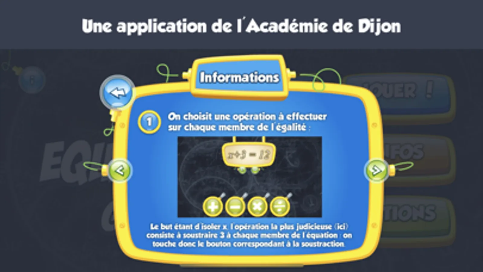 The Equations Game est un exerciseur méthodologique portant sur la résolution d’équations du premier degré à une inconnue, en cycle 4 et en seconde.