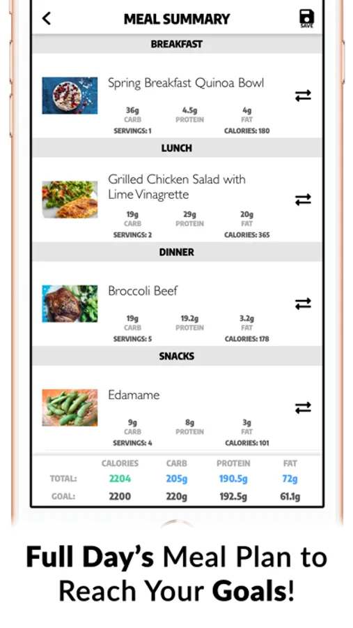 -Within seconds, you will get a full optimal meal plan randomly generated for you based off your customized settings!