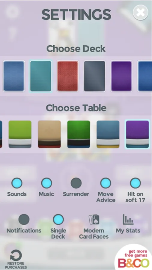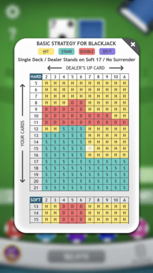 - Helpful strategy card shows basic strategy for the various rules settings.