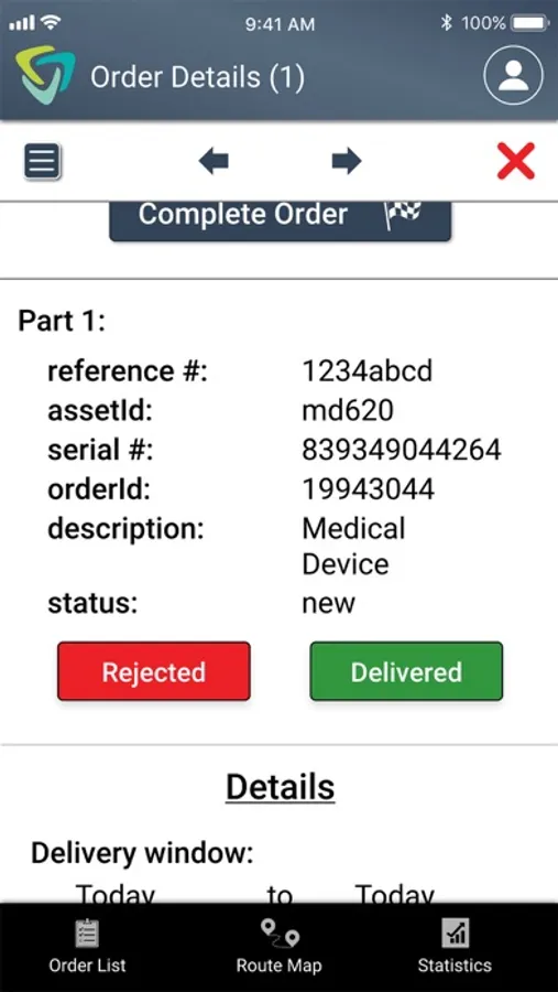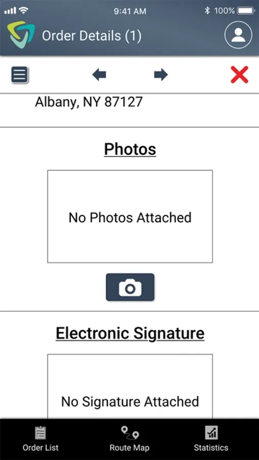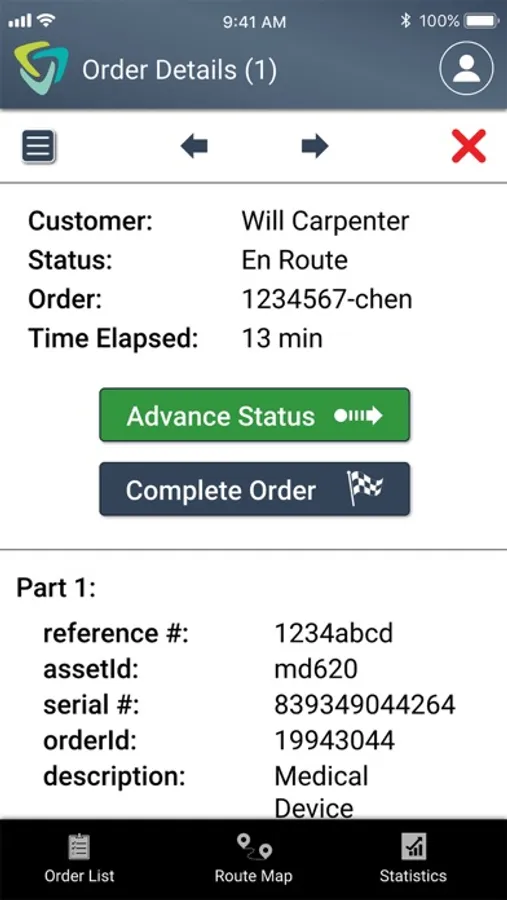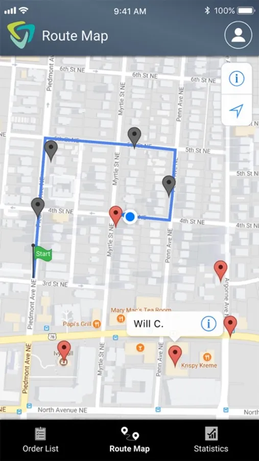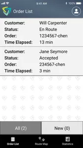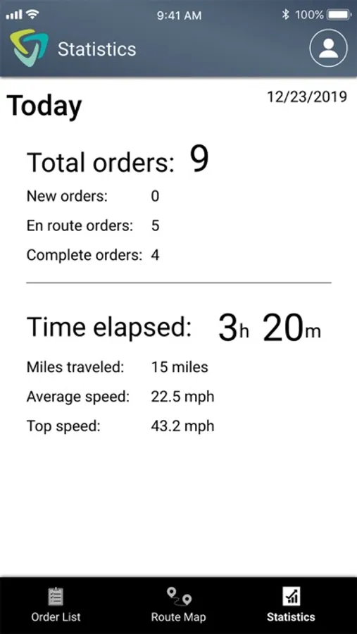 The day’s travel statistics, coupled with a real-time map showing the driving path and today’s orders, are conveniently accessed through the Route Map and Stats view. So, the user has both a visual of the whole workday and a summary of today’s progress, including the day’s orders, grouped by the delivery status, distance traveled, average speed, and top speed.