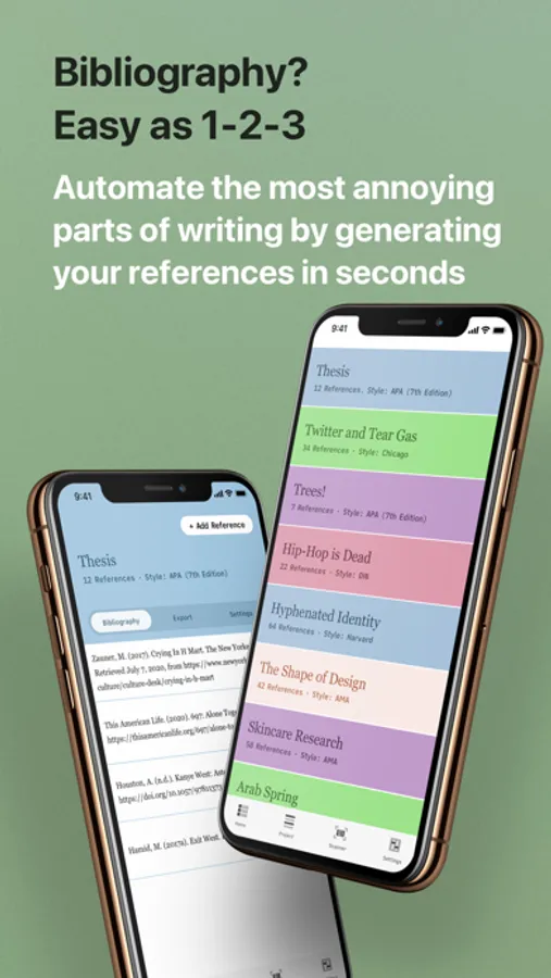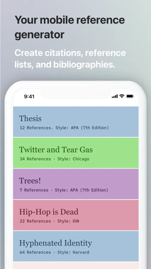 With Citationsy you can organize your citations into different projects and export them in over 10 000 different referencing styles (APA, Harvard, Chicago, MLA, DIN, and everything else). It includes search engines for books, music, podcast, and scientific papers to make finding the sources you want to cite even easier.