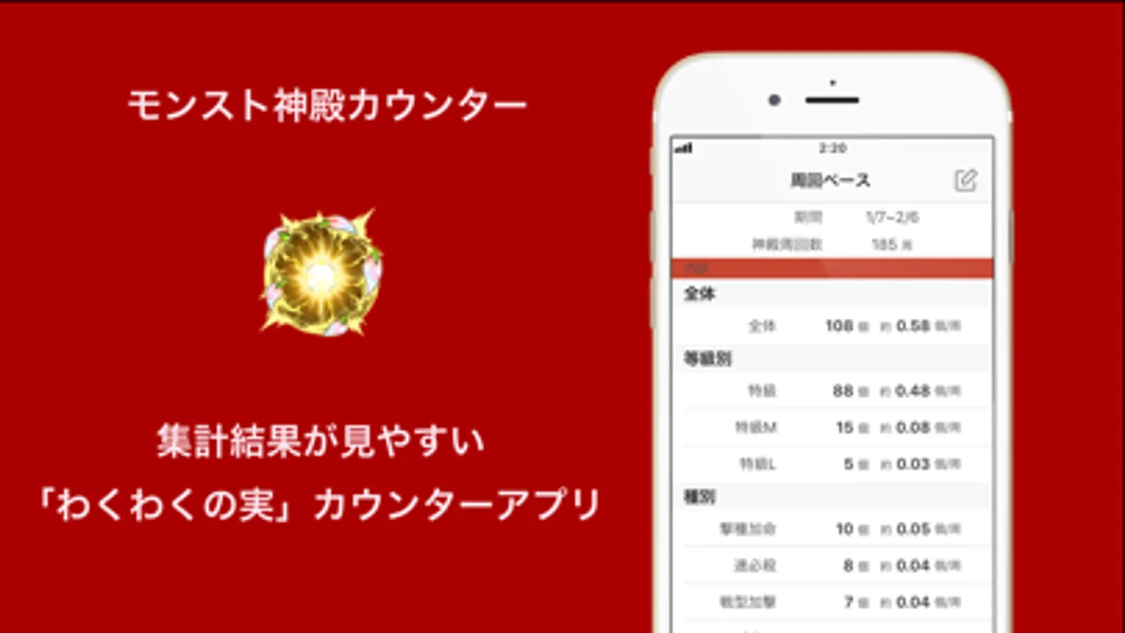 モンスターストライク(モンスト)の「英雄の神殿」ステージの周回好きのためのアプリです。周回ごとにドロップした「わくわくの実」を記録してモチベーションをアップ!