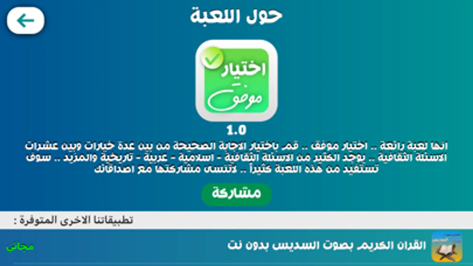 انها لعبة رائعة وعربية جديدة مسلية تحتوي على اسئلة ثقافية وعربية واسلامية وتاريخية والمزيد من المميزات التي ستتعرف عليها عندما تقوم بتجربة اللعبة .... لاتنسى تقييم اللعبة بعد تجربتها .. ومشاركتها مع اصدقائك.