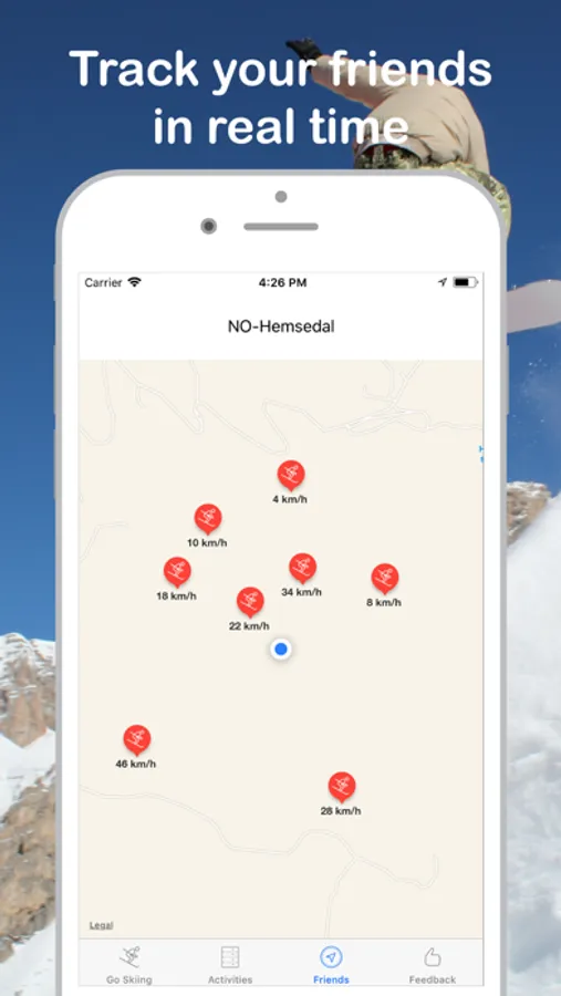 Skiing with Friends™ has an innovative social aspect. It features a real-time map with nearby friends and other skiers, so you can track where and how fast other skiers are going.