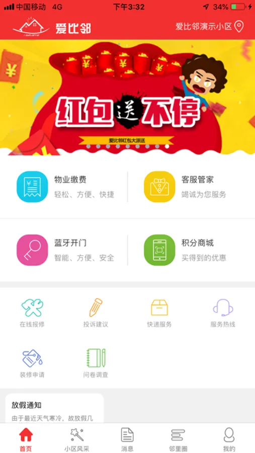 爱比邻智慧社区管理系统,用于建设智慧社区,打通物业管理端以及业主端,提供手机开门,停车管理,报事报修,费用缴纳以及邻里社交等等服务;
