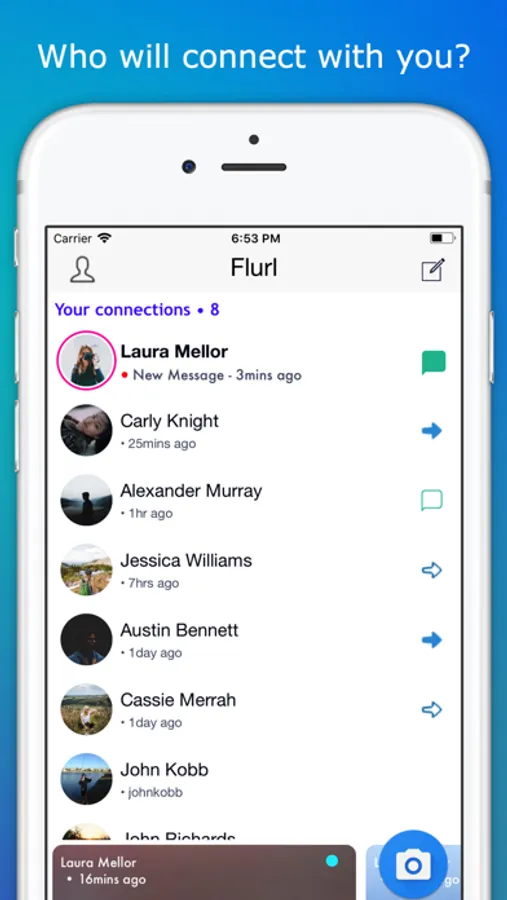 Connect with friends and people you know in a whole new way. All social media apps let you connect with people as friends or following. Flurl allows you to connect with people as one of two options. One option is friends, and the other, a more personal option, is interested. In order to connect, you both have to select the same option, and you won't be able to tell if or what they selected of you, until you connect. It becomes like a social guessing game, where you have to guess what the other person selected, so you can connect. The goal is to connect, so you can unlock the opportunity to share photos to each other’s feeds, and chat in a simple yet quick messaging interface. You cannot see who your friends connected with or what they connected as, to keep the app private. The point of Flurl is simple; instead of connecting on social media as only friending or following, you can connect as a second, more personal option. So join your friends, and connect with them today.