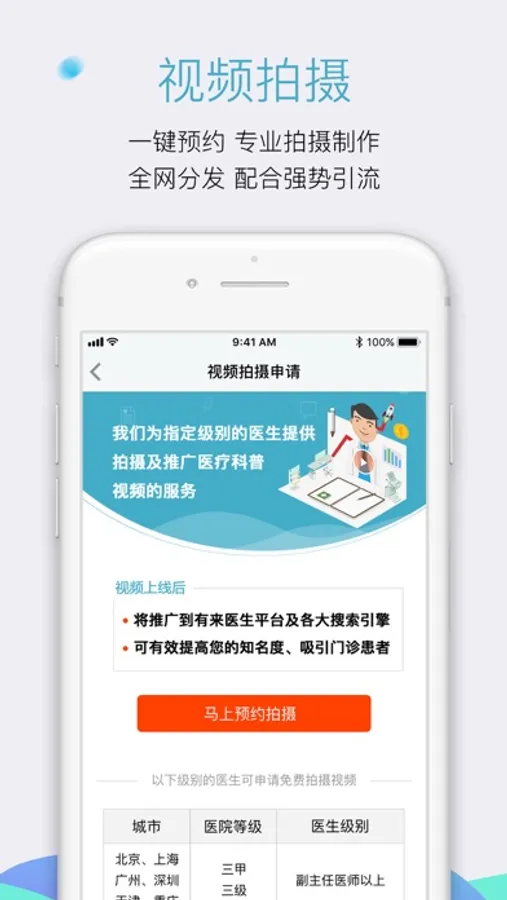 我们为医生提供免费拍摄及推广医疗科普视频的服务,医生随时可以预约有来医生专业拍摄团队进行拍摄。