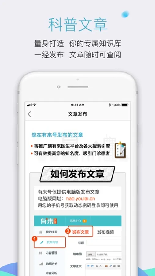 医生可以在有来医生的平台发布文章,所有文章将免费推广到各大搜索引擎。