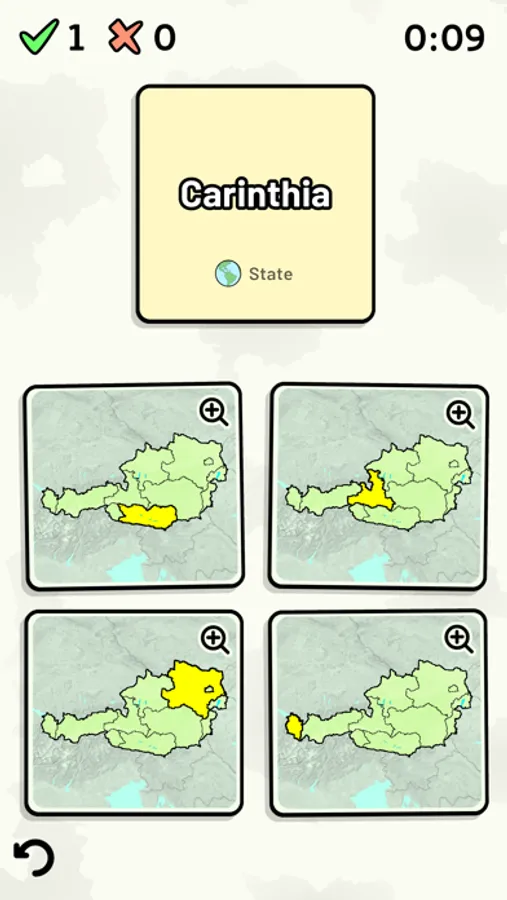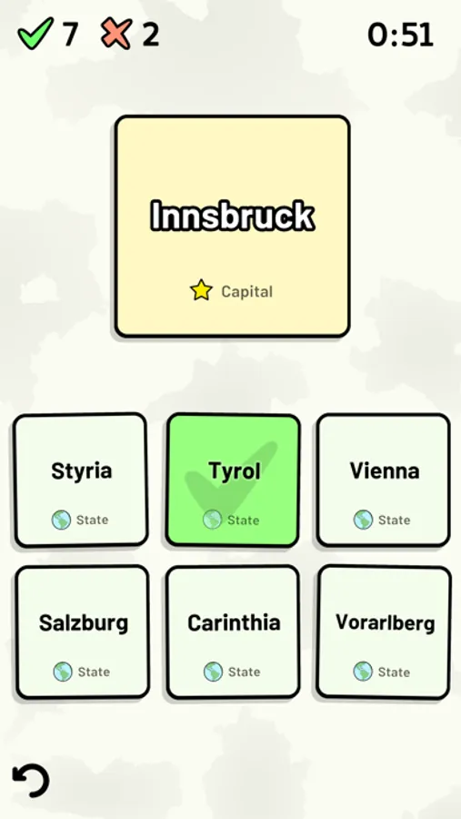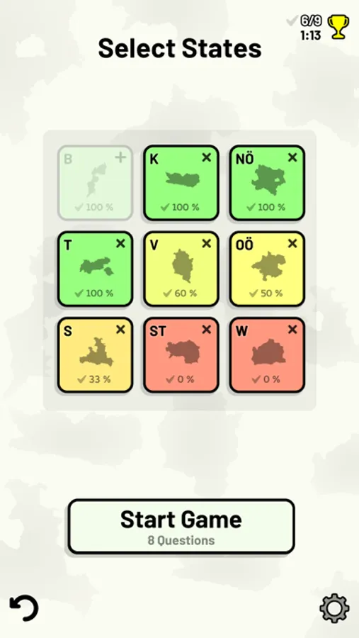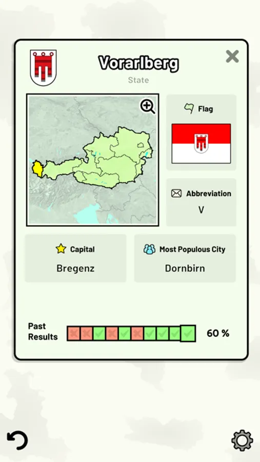 Customizable quizzes allow you to choose which states to test, as well as the topic. Past results for each state are displayed to highlight your progress at each topic.