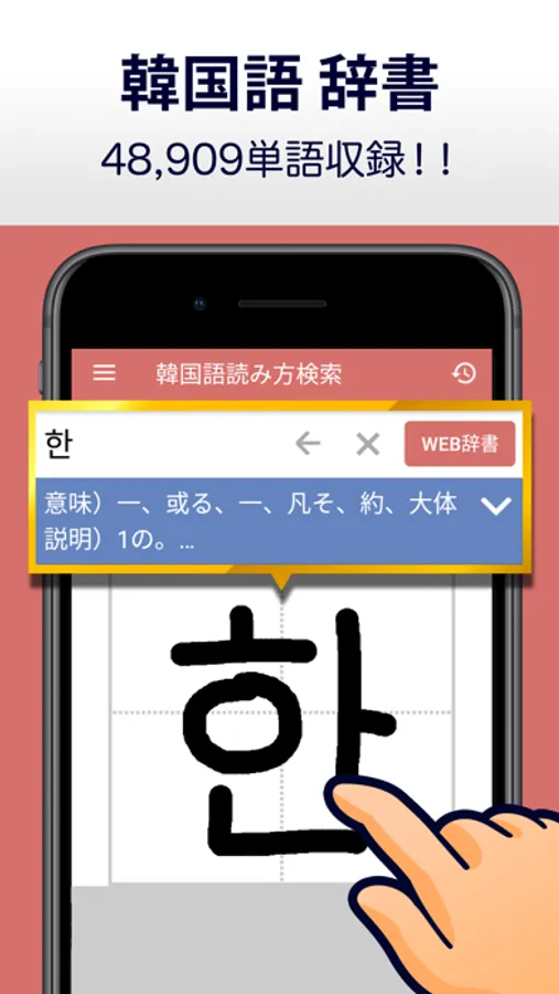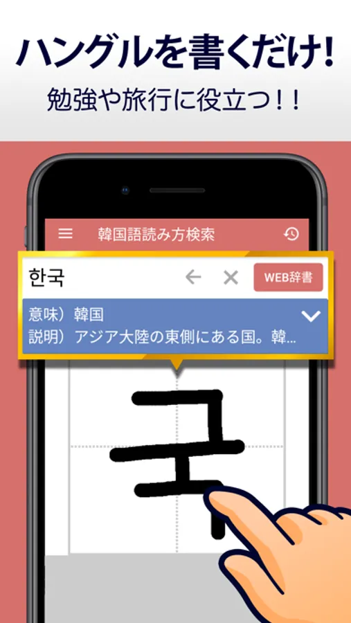 韓国語(ハングル文字)を手書きして、日本語での意味を調べることができる便利な韓国語辞書・翻訳アプリです。