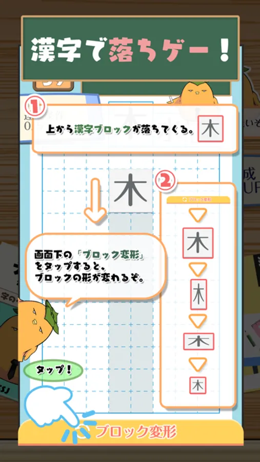 テト字スは、上から降ってくる漢字ブロックを変形させて積み上げ、完成した漢字をタップで消す