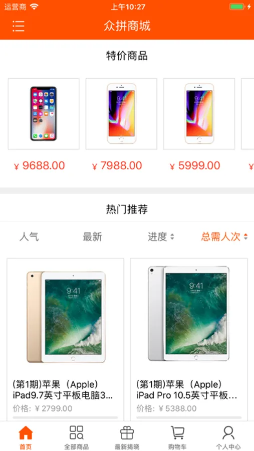3)主要具有首页商品、全部、购物车、个人中心等四大业务功能块组成。