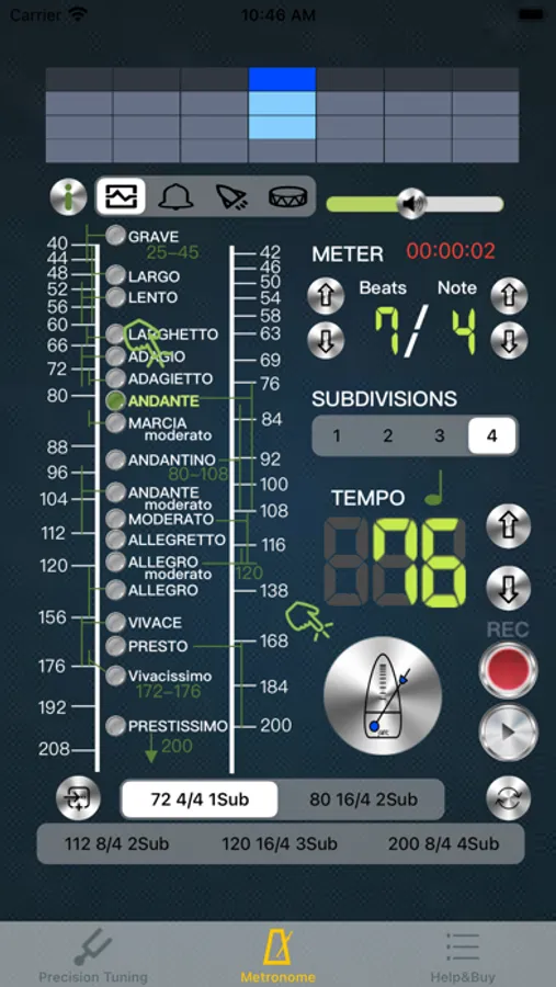 - Intuitive beat mode selection, 18 types, including: Grave 25-45 / Largo 40-60 / Lento 45-60 / Larghetto 60-66 / Adagio 66-76 / Adagietto 72-76 / Andante 76-108 / Andantino 80- 108 / Marcia moderato 83-85 /Andante moderato 92-112 / Moderato 108-120 / Allegretto 112-120 / 116-120/ Allegro 120-156 / Vivace 156-176 / Vivacissimo 172-176 / Presto 168-200 / Prestissimo 200 Bpm and over