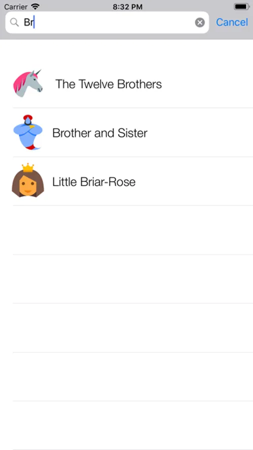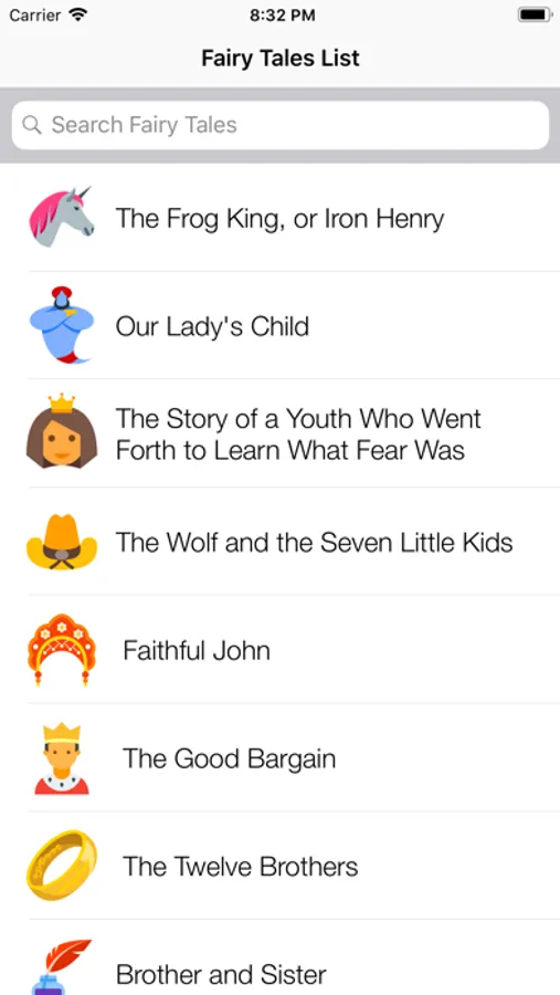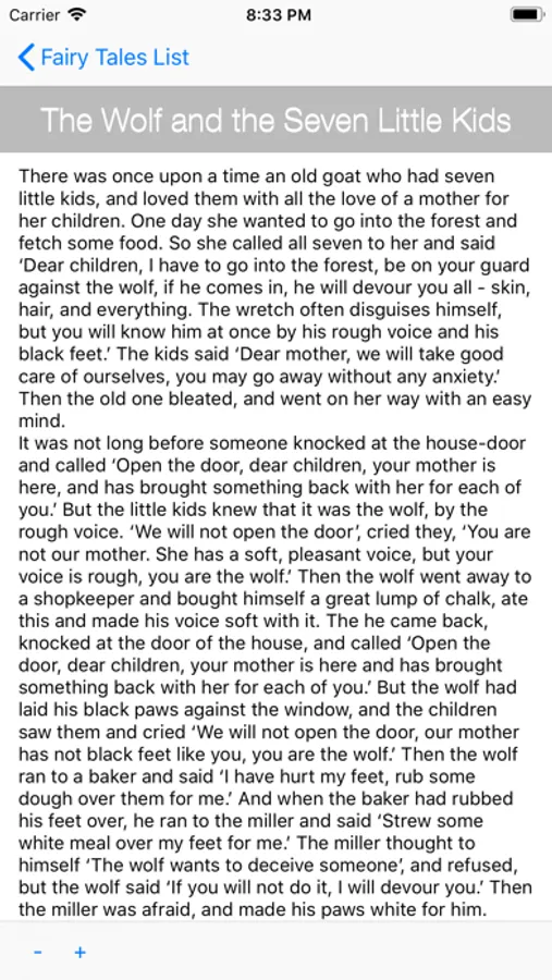 You can choose a story through the search bar. If you search your favourite story, type a few letters of its title in the search bar. You can adjust the font size on a fairy tale to make the text smaller or larger using the buttons "+" and “-".