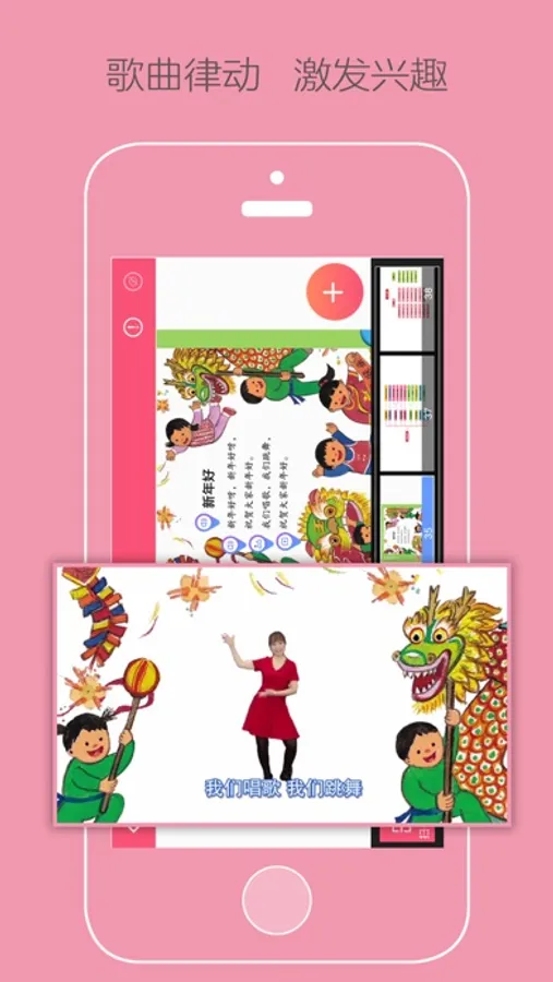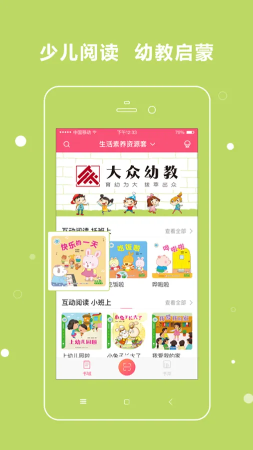 App现有内容为大众幼教新研发的主题课程《生活素养资源套》的多媒体资源部分,包括故事动画、歌曲音频和视频、古诗/童诗朗读、互动游戏、亲子游戏、4D动画、VR全景等内容。