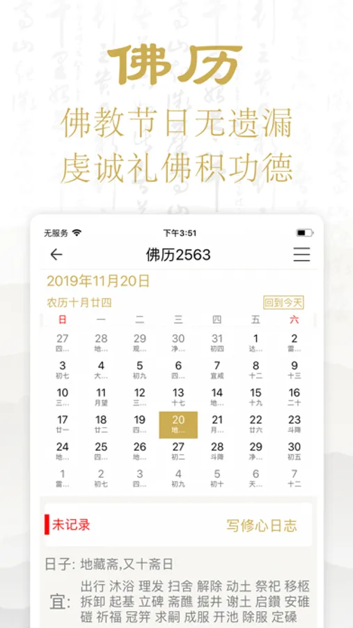 7、佛历万年历:佛历结合传统万年历,老黄历,佛教节日于一体,增加佛诞、斋日等佛家日程提醒;