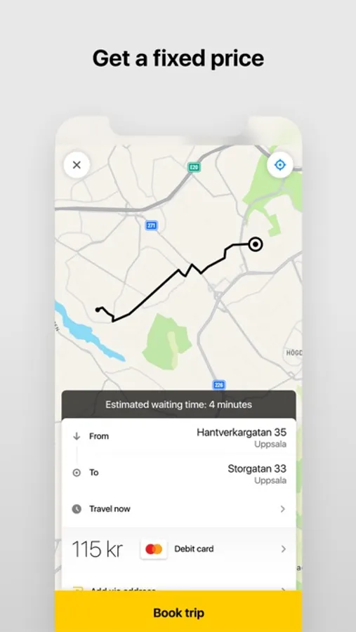 With the Uppsala Taxi app you book your taxi with ease. You’ll always get a fixed price on your trips and you’re able to pay by card or PayPal in the app to make your ride as smooth as possible.