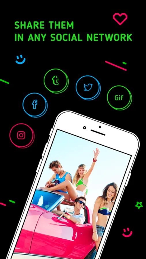 - Share them in any social network: Instagram, Facebook, Twitter, Tumblr, as a GIF, or in a video.