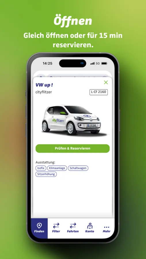 Mit der cityflitzer-App findest du verfügbare Fahrzeuge in deiner Nähe. Du kannst sie für 15 Minuten reservieren oder direkt öffnen. Hier kommen alle wichtigen Funktionen in der Übersicht: