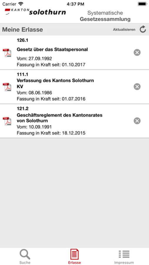 Die App «Gesetze» ermöglicht den mobilen Zugriff auf die Gesetze des Kantons Solothurn. Die Gesetze sind systematisch nach Sachgebieten geordnet und nummeriert.