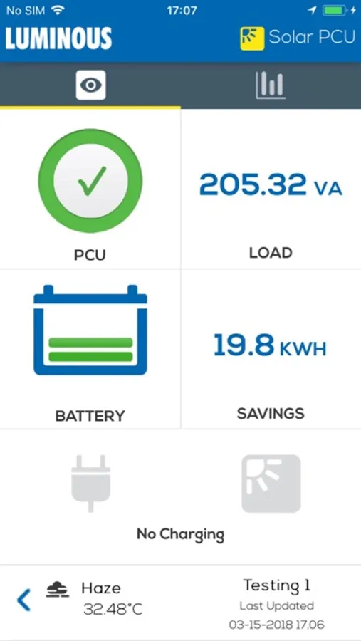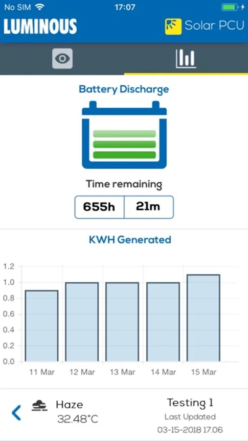 The Solar PCU mobile App developed by Luminous power technologies - leading power solution company, is used in monitoring live parameters of Solar PCU from remote location allowing you to know solar generation trend. It enables you to login using unique User id available on Solar PCU back panel, printed on a sticker. Following are the major features of the App.