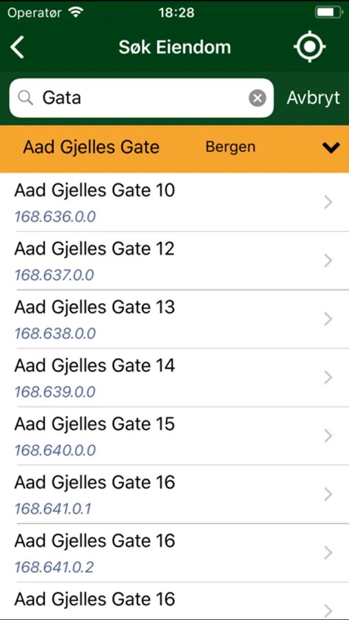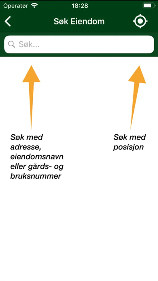 Eiendom velges enten ved å søke på adresse eller ved hjelp av GPS-posisjon.