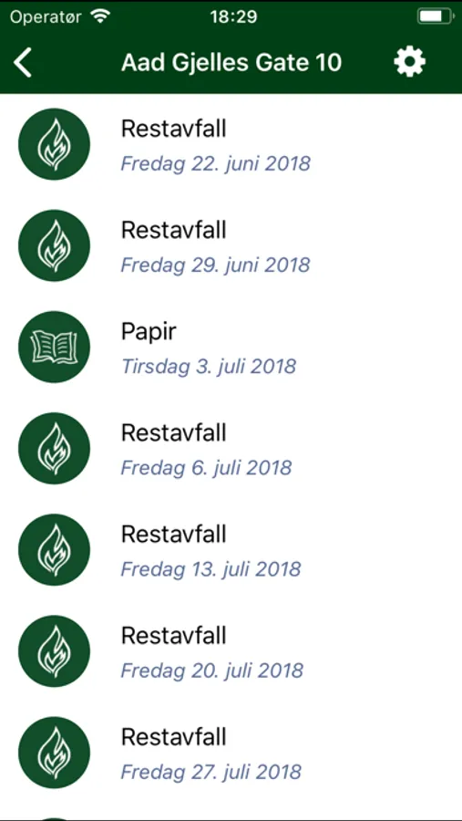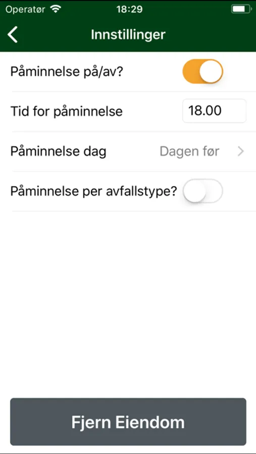 Tømmeplanen viser tidspunkt for hvilken type avfall som skal tømmes for valgte eiendom. Varsling dagen før tømmedag blir automatisk satt, men kan endres i innstillingene. Det kan du endre tidspunkt for varsling og om du ønsker kun varsling for vises avfallstyper.