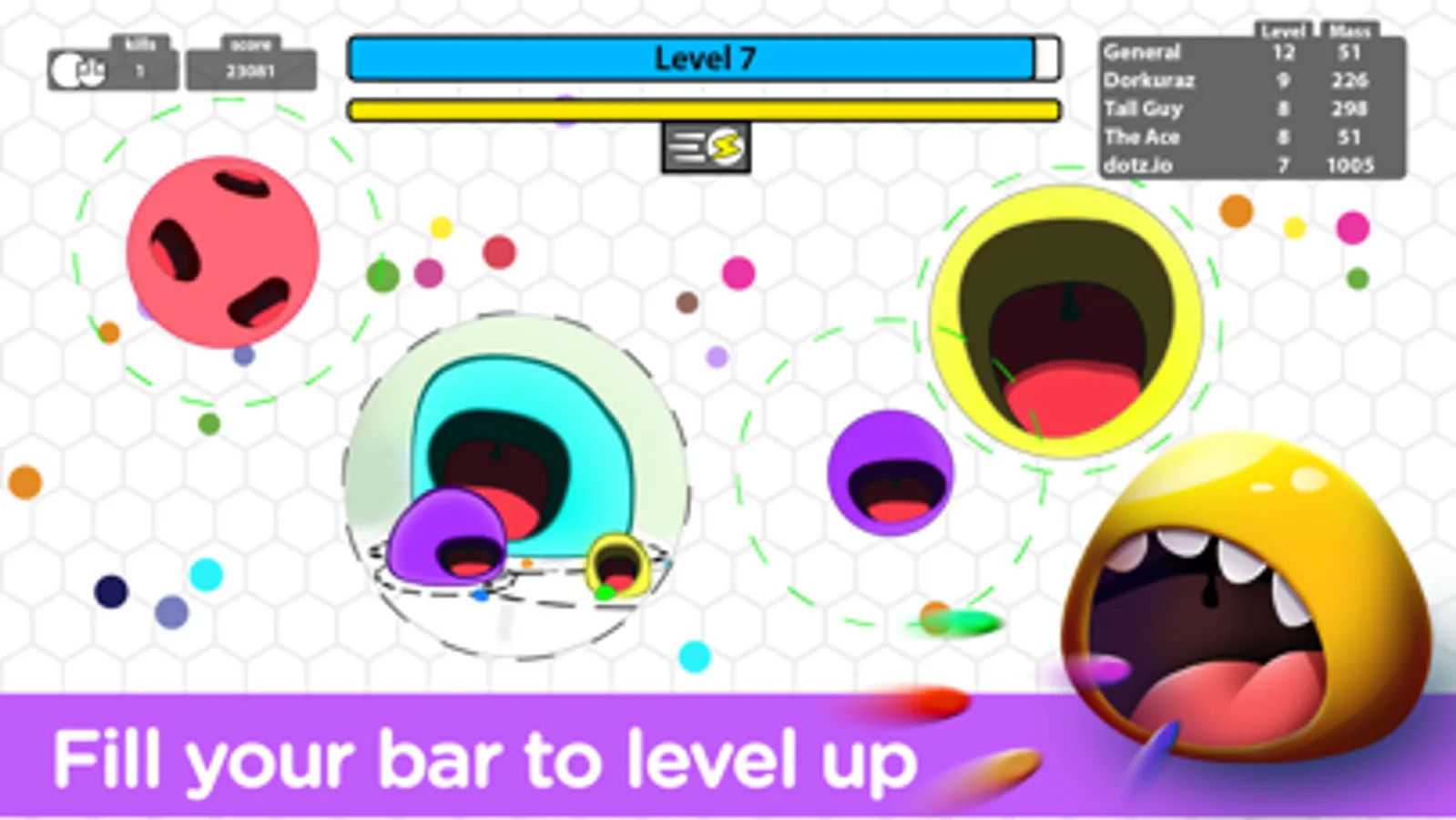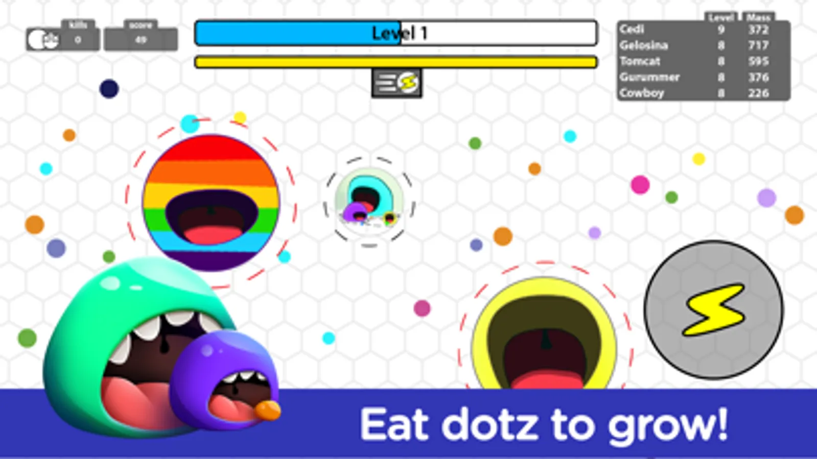 Your goal is to become the biggest dot among others! But there is a catch: Each time you level up, your mass shrinks and you have to scale up even more!