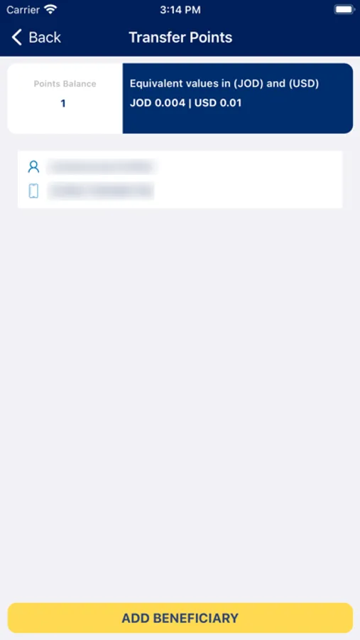 Through the application, choose the transfer icon then add new beneficiary to the list of beneficiaries, noting that the beneficiary must be participant in JKBRewards program. Select the required beneficiary then select transfer You will receive a One Time Password (OTP) to complete the transfer .
