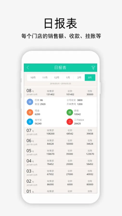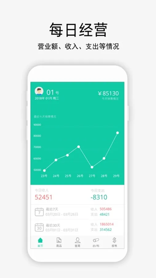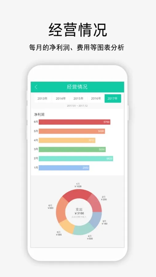 图表分析每日每月企业的经营情况、成本利润、收入支出、营业额、挂账等。