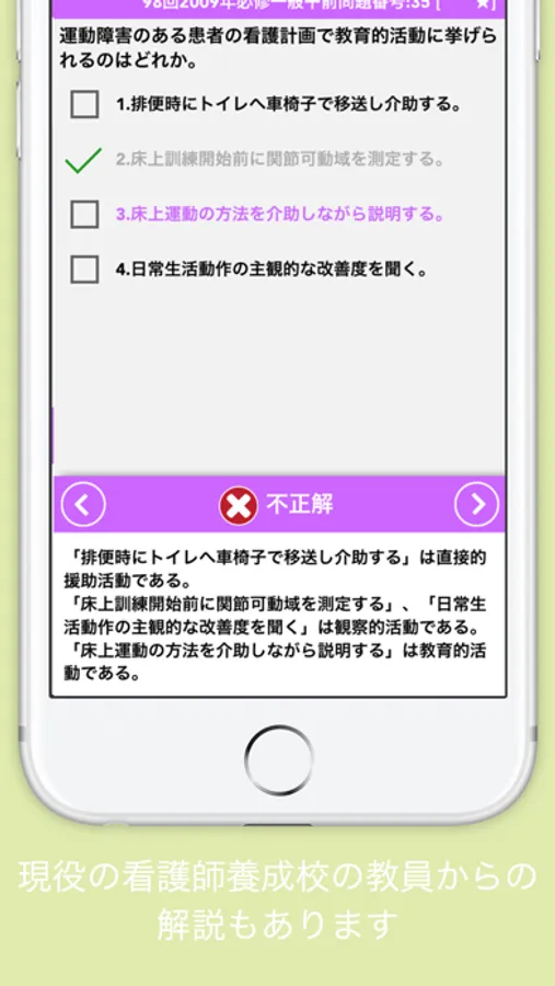 配信される問題には、看護師国家試験過去問題と、その選択肢を○×問題に改変した問題が含まれます。
