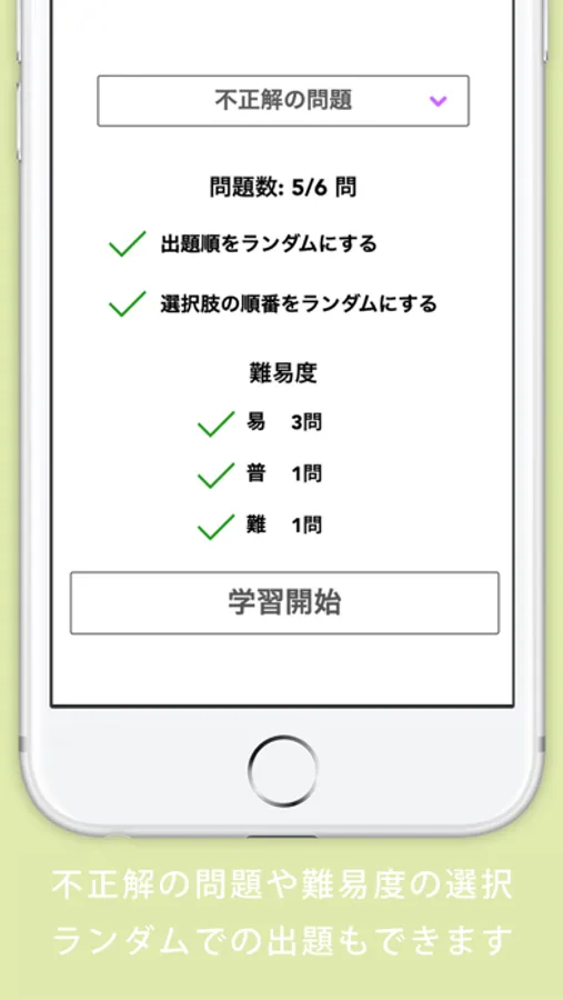 ・復習/自習では出題順や選択肢の表示時のランダム化が可能です