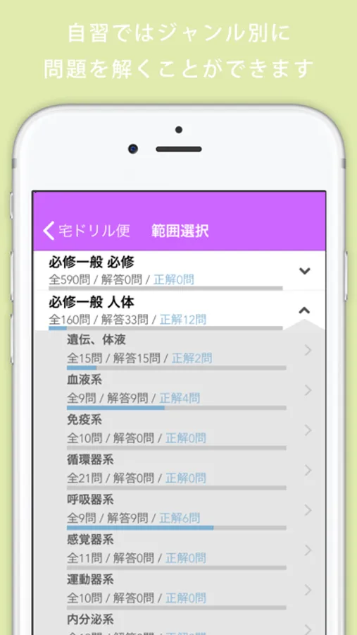 ・詳細にジャンル分けされた「自習」で自分のペースで勉強できます