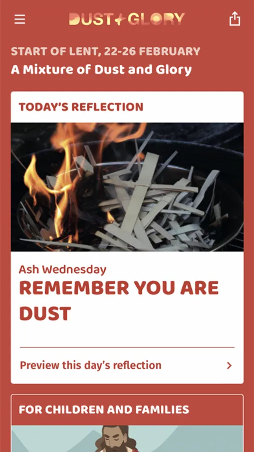 The prayers, challenges and reflections for both adults and children are taken from Dust and Glory booklets from Church House Publishing.