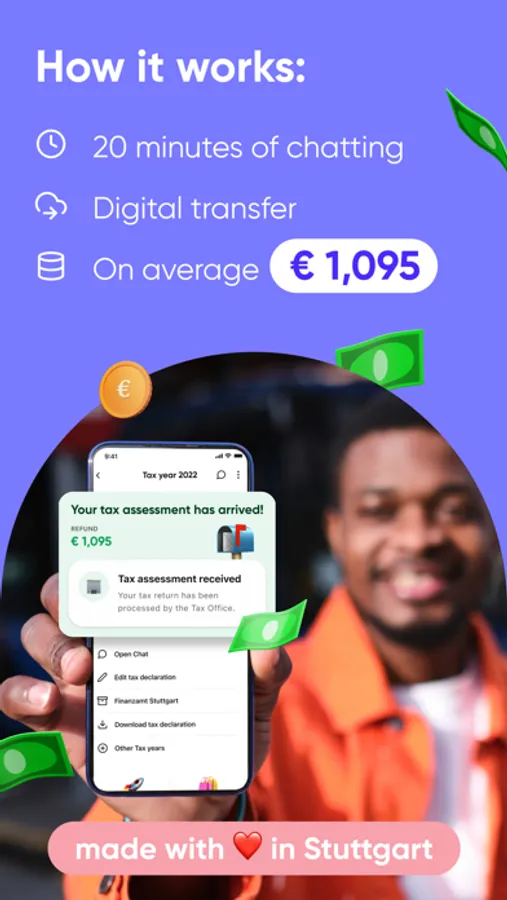 Get an average tax refund of €1,095. Complete your tax return in 20 minutes for 2021, 2020, 2019 and 2018 with simple questions in Steuerbot Chat and submit it via ELSTER.
